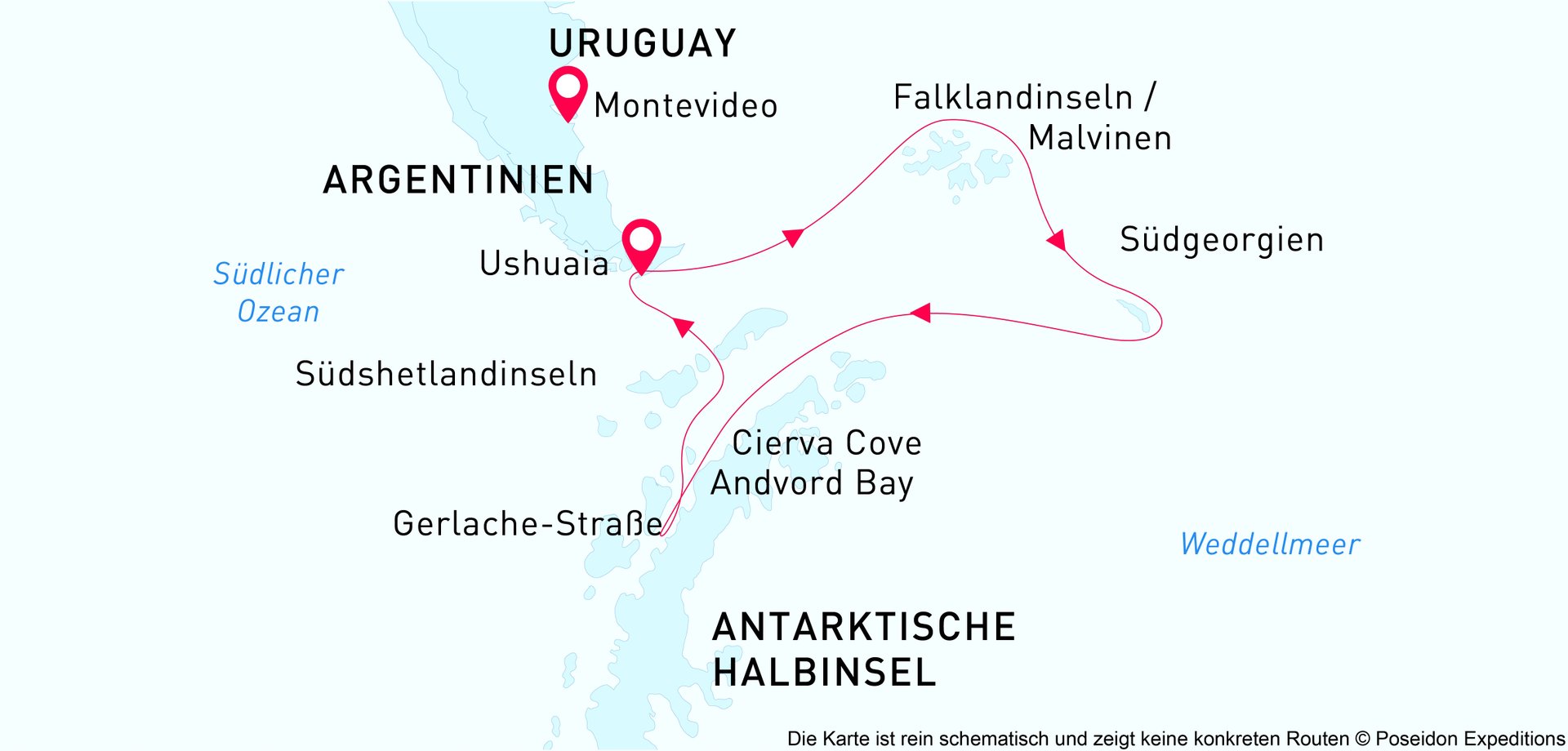 - Die oben genannte Beschreibung sollte als beispielhaft gelesen werden, die sich jederzeit ändern kann. Der Schiffskapitän wird in Verbindung mit der Expeditionsleitung laufend den Routenplan entsprechend der jeweiligen Wetter- und insbesondere der Eisbedingungen anpassen, um Anlandeplätze auszuwählen und die Begegnungen mit Wildtieren zu maximieren