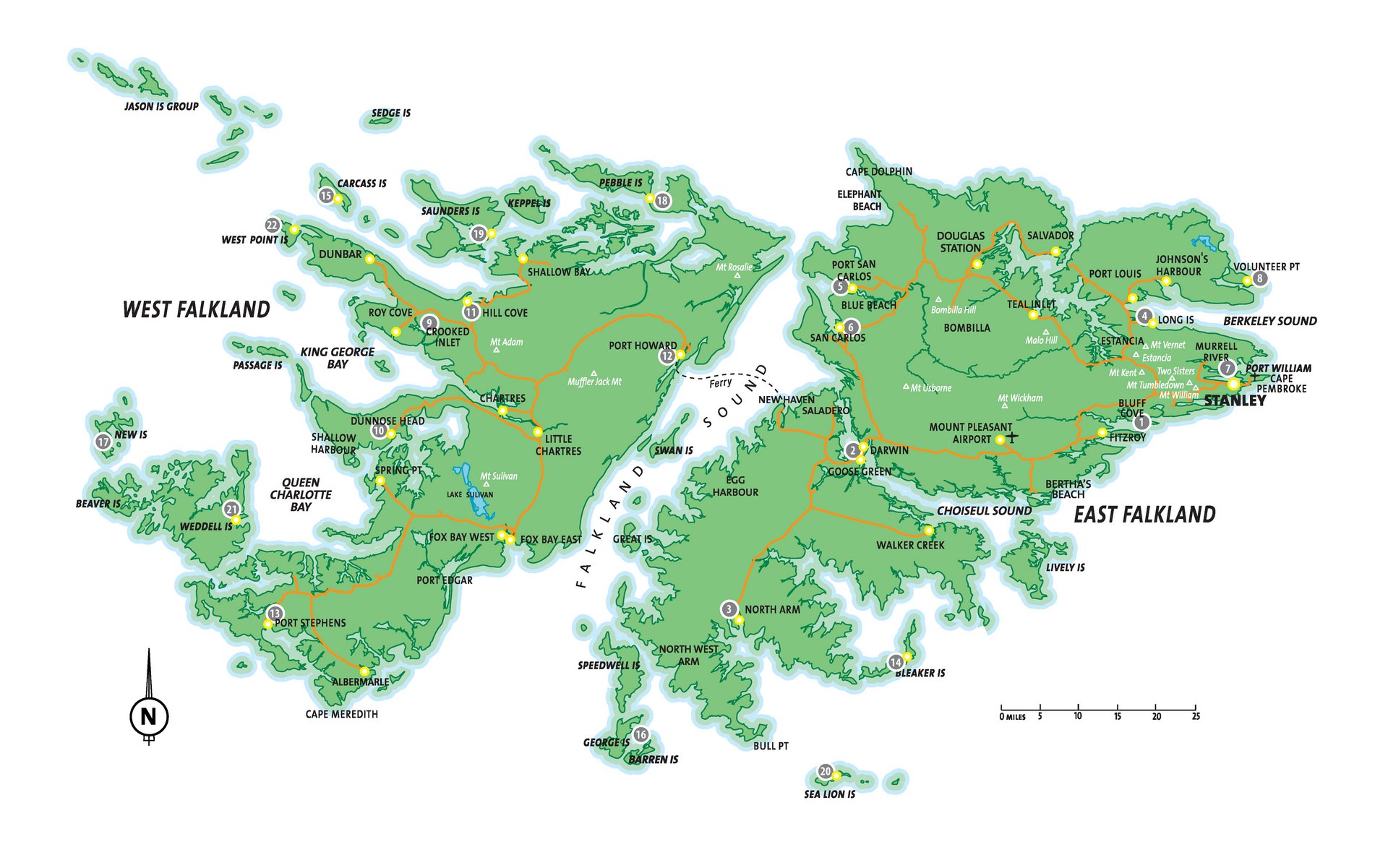 - Flüge zwischen den Inseln werden vom Falkland Islands Government Air Service (FIGAS) durchgeführt
