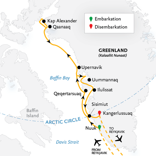 Keine andere Reise in unserem Grönland-Portfolio führt weiter in den Norden als unsere 16-tägige Reise Nordwestgrönland: Erkundung des hohen Nordens – die bis zum erstaunlichen 78. Breitengrad führen kann. Ideal für Gäste mit einer Leidenschaft für Entdeckungen und selten besuchte Ziele: Diese Reise führt in Regionen, die mit legendären Entdeckern wie Knud Rasmussen und Robert Peary verbunden sind. Tatsächlich ist dies wohl die einzige Arktisreise im Jahr 2027, die die abgelegenen Gemeinden von Upernavik besucht und den bemerkenswerten Smith Sound erkundet, wo an klaren Tagen Grönland und Kanada am selben Horizont sichtbar sind.
