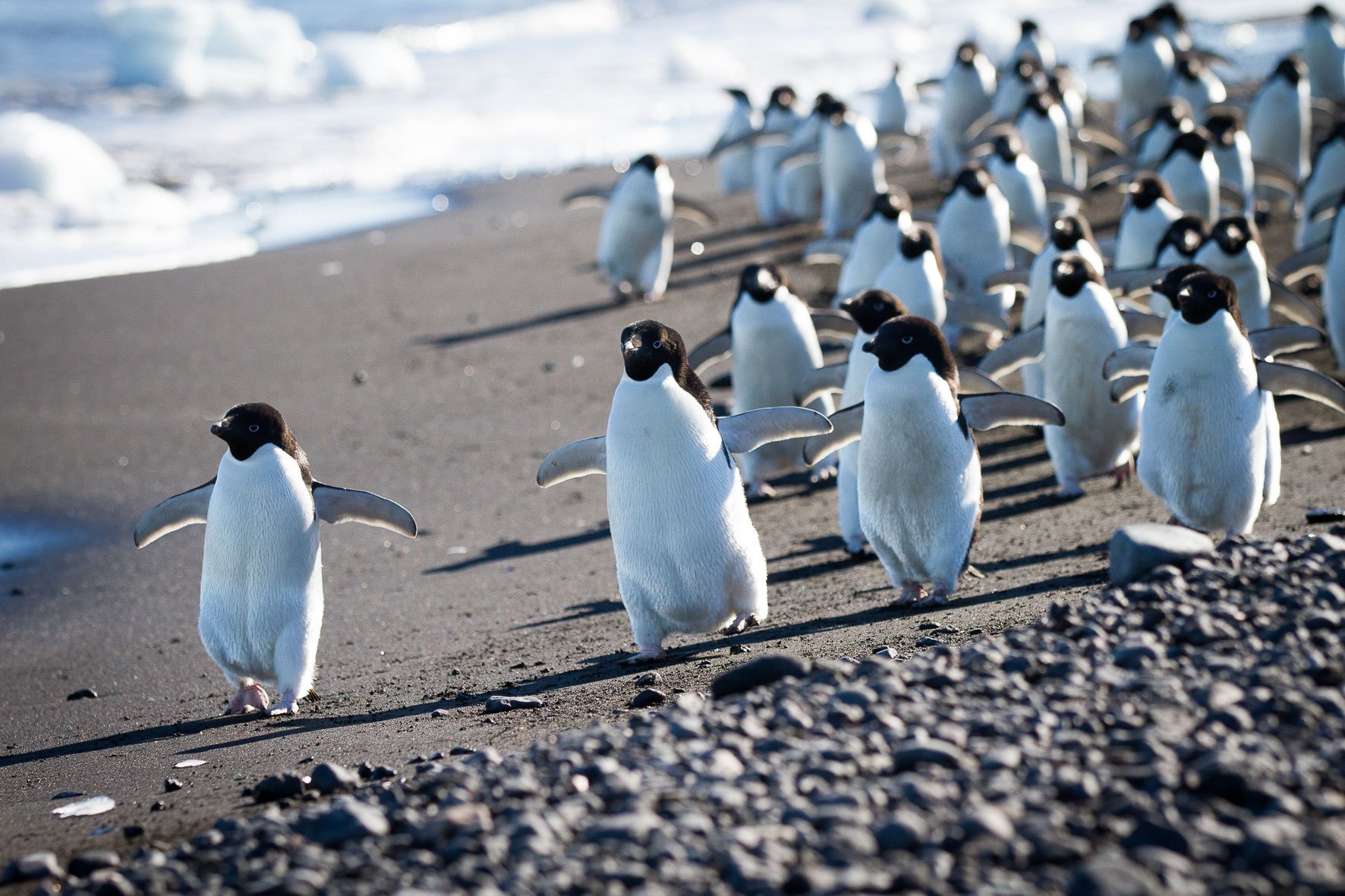 Cape Adare: Eine große, flache Landzunge, voller atemberaubender Aussichten auf die größte Adelie-Pinguin-Kolonie der Antarktis: ein Tumult aus Geplapper, Kükenfütterung, Territorialstreitigkeiten und Kleindiebstahl. Neugierige Pinguine kommen oft ganz nah heran und bieten hervorragende Fotomotive. Unter den sich bewegenden Pinguinen finden wir Carsten Borchgrevinks Hütte, die älteste in der Antarktis, eine Überwinterungshütte für die erste Expedition auf den Kontinent im Jahr 1899.