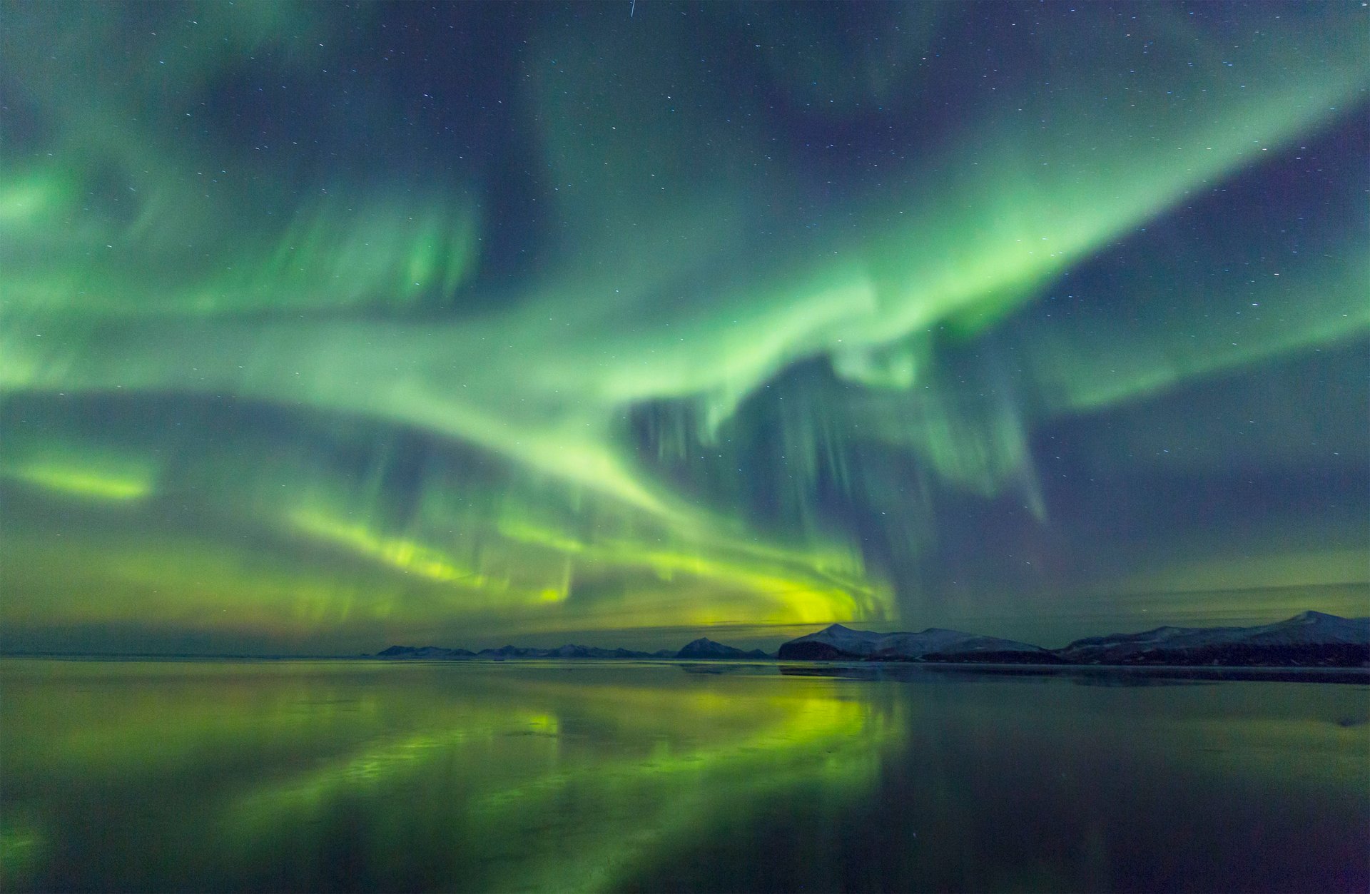 Im September, zur Tagundnachtgleiche, haben Tag und Nacht die gleiche Chance, Sie in Erstaunen zu versetzen. Wenn die Nacht hereinbricht, wird der sich verdunkelnde Himmel zur Bühne für das größte Himmelsschauspiel der Natur: die Nordlichter. Ostgrönland ist einer der besten Orte in der Arktis, um dieses außergewöhnliche Naturphänomen zu beobachten. Der Himmel über Scoresbysund liegt nicht nur auf dem perfekten Breitengrad für starke Polarlichter, sondern wird auch oft durch katabatische Winde, die vom nahe gelegenen grönländischen Eisschild herabwehen, gereinigt. Die von Horizont zu Horizont tanzenden Lichter spiegeln sich in den ruhigen Gewässern, während die Silhouetten gigantischer Eisberge und zerklüfteter Berge die romantische Pracht dieses Erlebnisses noch verstärken.