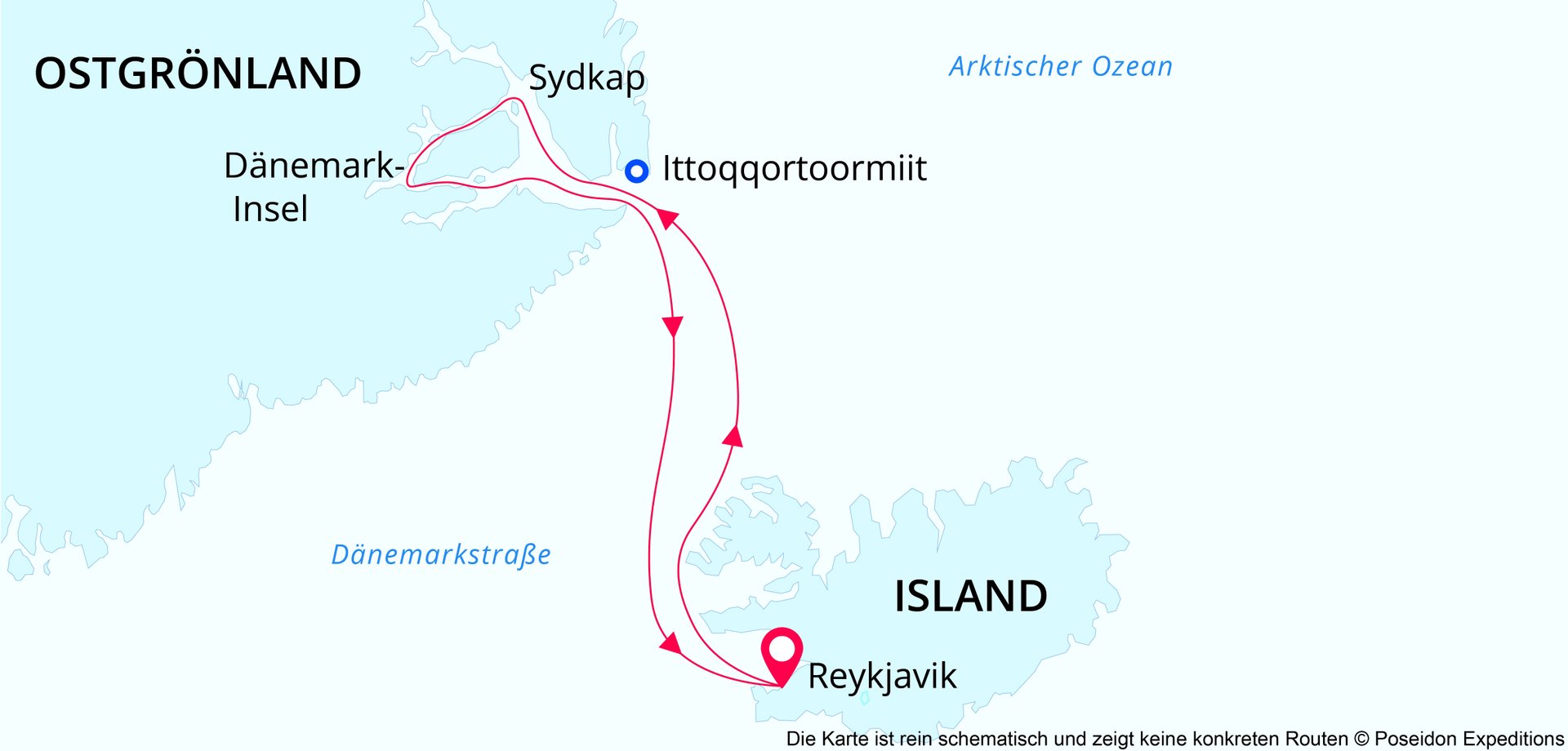 Unsere Reise beginnt in Reykjavik, Island. Ein letzter Stopp auf unserem Weg nach Grönland ist die isländische Siedlung Ísafjörður in den Westfjorden. Wir überqueren die Dänemarkstrasse und treten ein in eine andere Welt. Im größten Fjordsystem der Erde, dem Scorsbysund in Ostgrönland, erleben wir fantastische Tage. Wir entdecken eine unbeschreiblich schöne und faszinierende Landschaft, historische Stätten, riesige Eisberge, eine moderne Inuit Siedlung.