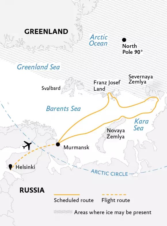 Entlang der sibirischen Küste befinden sich mehrere Orte und kleine Inselgruppen, die wir zu erforschen hoffen. Hier können wir auch den Weg der Polarforscher auf der Suche nach der Nordost-Passage nachvollziehen. Wetter und Eis werden unsere Reiseroute und Anlandungen bestimmen. Wir werden uns jedoch bemühen, einige Gebiete wie die Russki-Insel, die Troinoi-Insel und das Kap Tscheljuskin zu erreichen. Sowohl die Russki- als auch die Troinoi-Insel gehören zu dem größten Naturreservat in Eurasien, dem „Großen Arktischen Schutzgebiet“. Auf der Russki-Insel steht eine ehemalige Polarstation, die teilweise dafür errichtet wurde, um den Schiffsverkehr entlang des nördlichen Seewegs, einem russischen Teil der Nordost-Passage, zu überwachen.