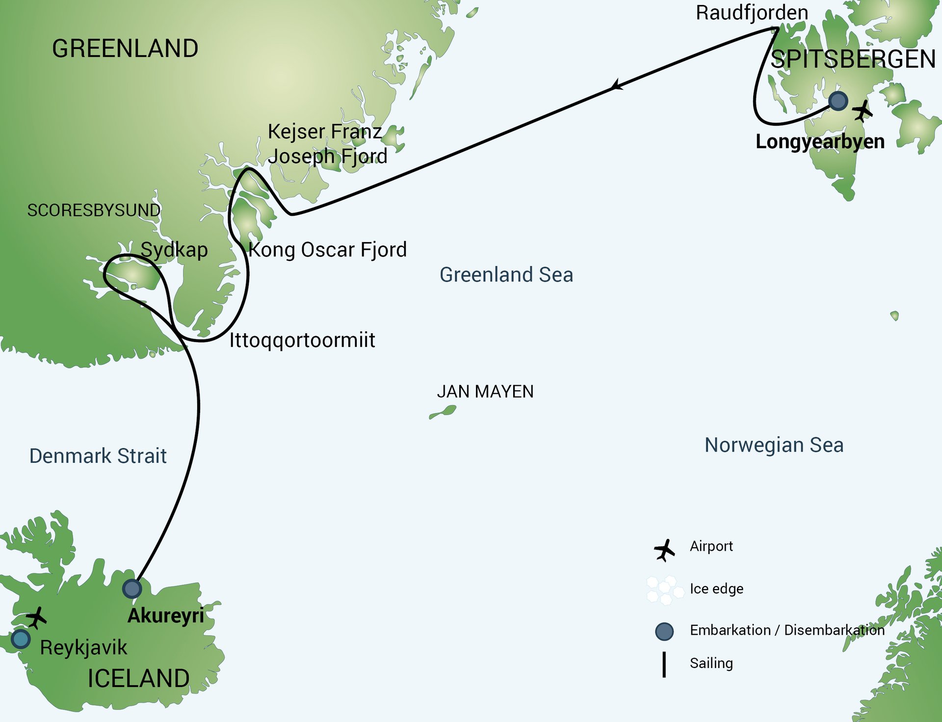 - Von Spitzbergen entlang der Ostküste Grönlands nach Island