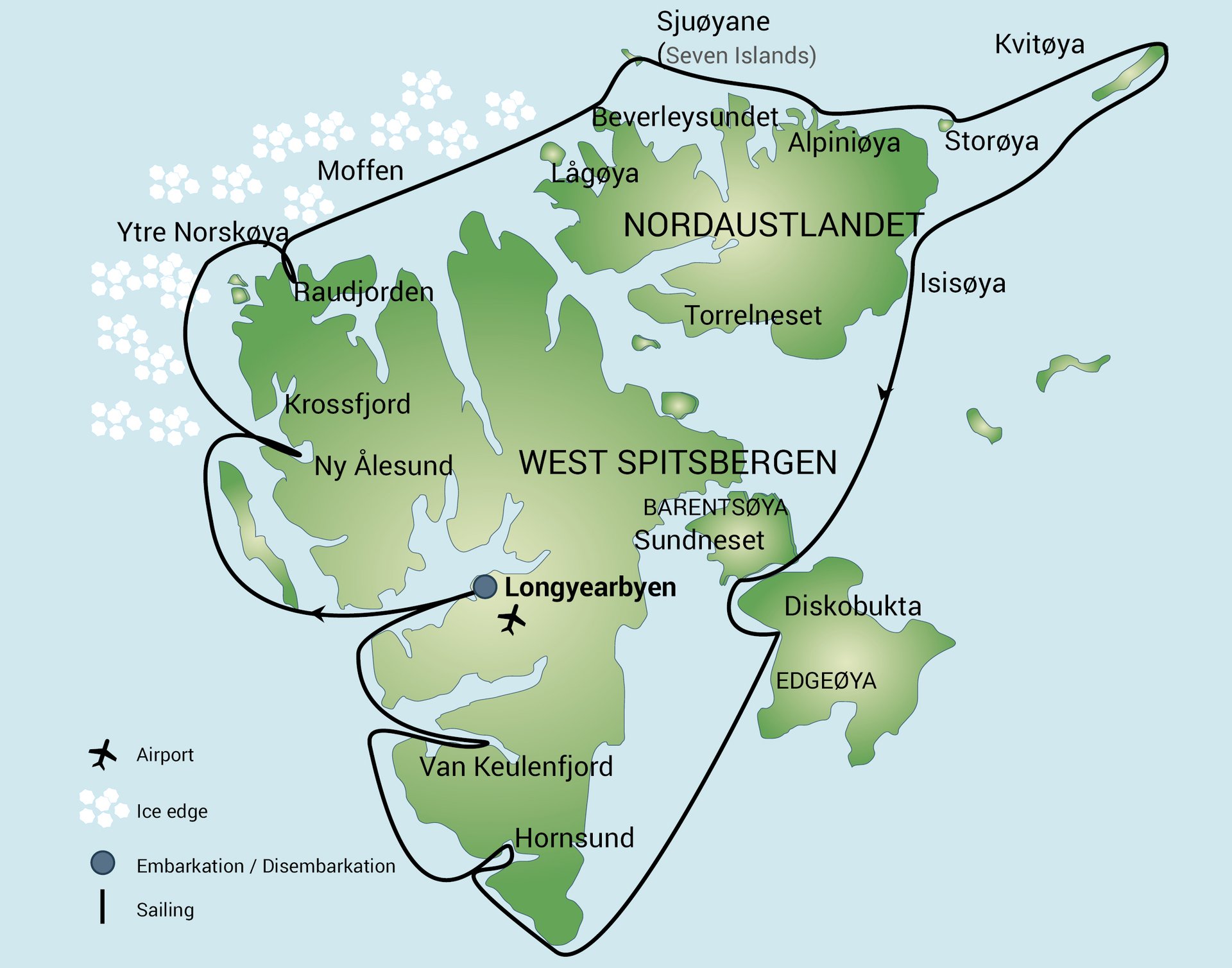 Achtung: Die Chancen, dass wir eine vollständige Svalbard-Umrundung (basierend auf unseren Erfahrungen aus den Reisen im Zeitraum 2013-2019) durchführen können, liegen bei 70%. Für den Fall, dass wir keine vollständige Umrundung machen können, können wir auf eine Umrundung von Spitzbergen durch die Hinlopenstraße zurückgreifen. Diese Reiseroute dient nur zur Orientierung. Das Programm kann je nach Eis-, Wetter- und Wildtierbeobachtung variieren. Anlandungen sind abhängig von der Verfügbarkeit von Plätzen, Genehmigungen und Umweltbelangen gemäß AECO-Vorschriften. Offizielle Fahrpläne und Anlandeplätze werden vor Beginn der Saison mit AECO festgelegt, aber die Expeditionsleitung bestimmt den endgültigen Fahrplan. Flexibilität ist bei Expeditionskreuzfahrten äußerster Wichtigkeit. Die Durchschnittsgeschwindigkeit unserer Schiffe ist 10,5 Knoten.