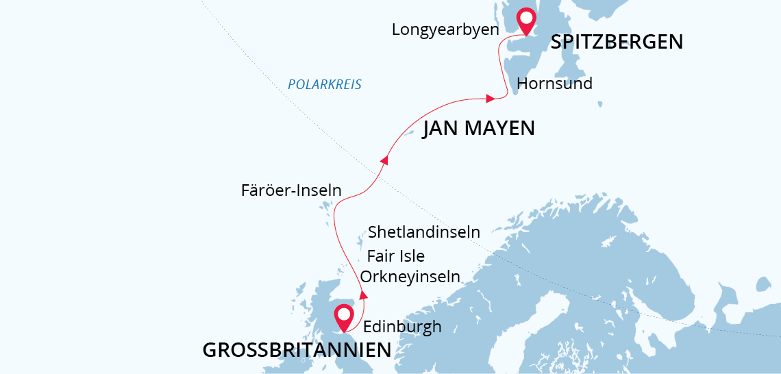 Von den historischen Stätten der Orkney-Inseln, die teilweise über 5000 Jahre alt sind, bis hin zur unberührten Wildnis der Färöer-Inseln und dem geheimnisvollen Jan Mayen, eine vulkanische Insel von atemberaubender Schönheit und mystischer Ausstrahlung, dominiert vom Berg Beerenberg.