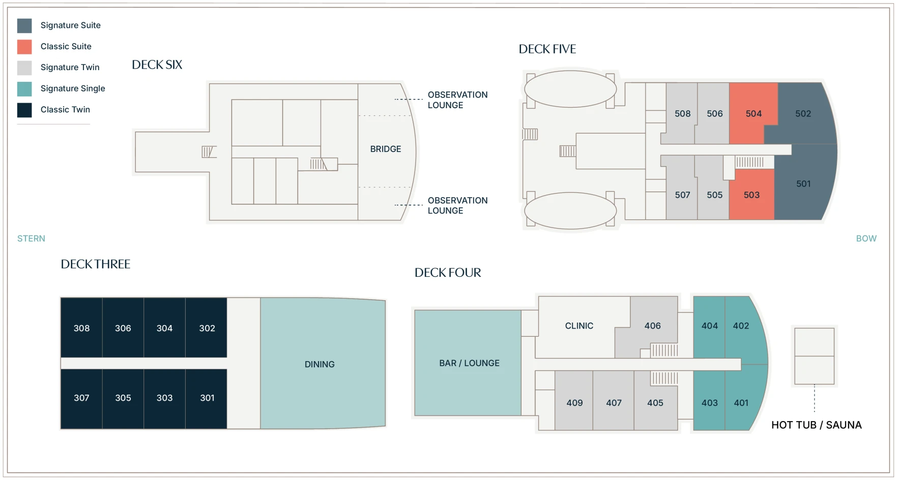 Geboren als Forschungsschiff, gehört sie zu einer Klasse, die sich einen Namen für die Erkundung der Polargebiete gemacht hat. Jetzt wurde sie neu konzipiert und renoviert für authentisches, langsames Reisen in die entlegensten Winkel der Erde. Sie verbessert das Erlebnis und erfüllt die Bedürfnisse echter Entdecker, ohne Kompromisse beim Komfort einzugehen. Sie ist die ultimative Wahl für echte Erkundungen in kleinen Gruppen im tiefen Süden und hohen Norden.